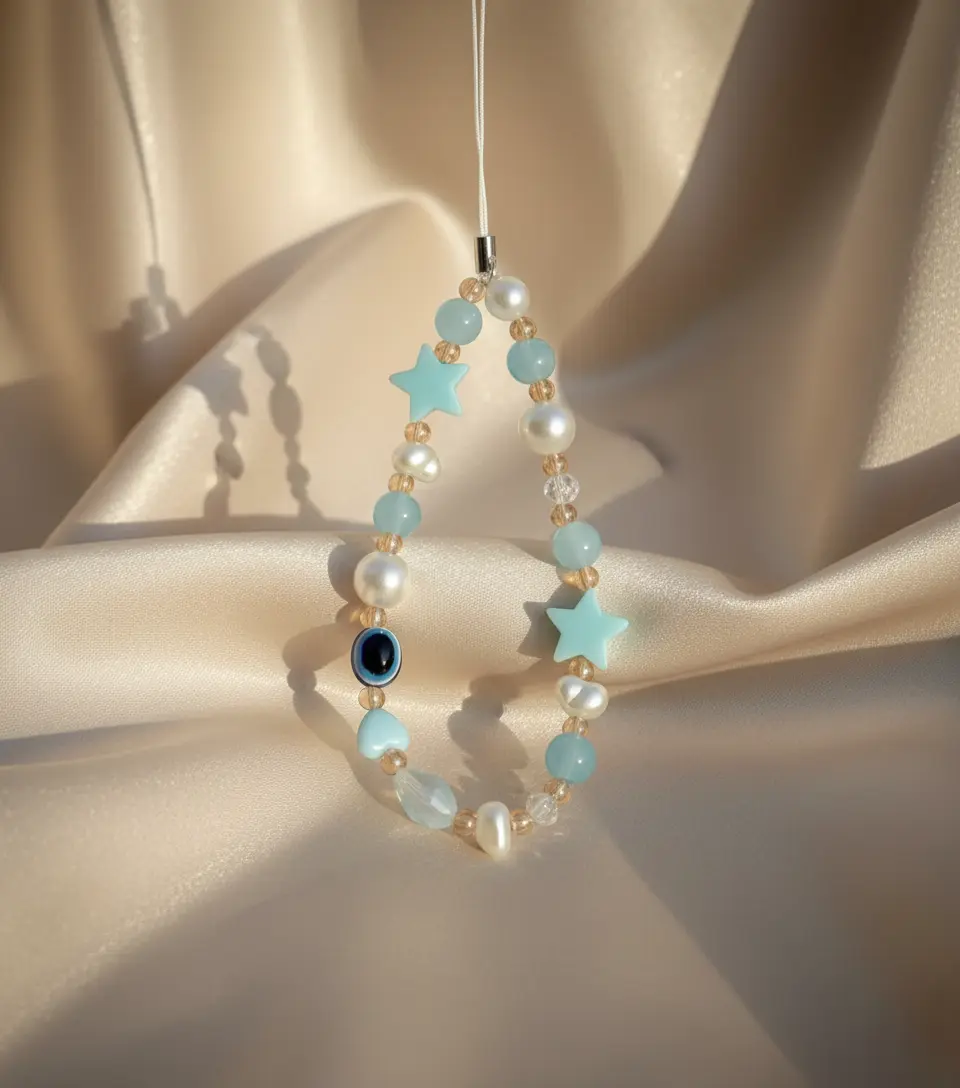 This cute beaded accessory is perfect for your phone, bag, or wrist. It’s handmade with love and care. The beads include light blue stars, white pearls, gold spacers, and a special evil eye bead. Each one adds color and meaning.