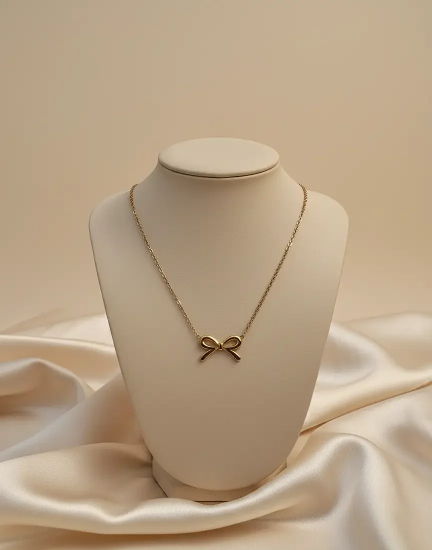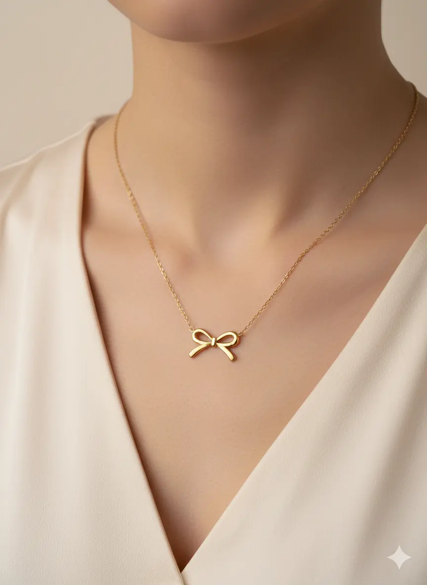 The pendant is a beautifully sculpted, symmetrical bow, polished to a mirror shine in a warm gold tone. Its clean lines and gentle curves give it a contemporary feel while retaining its endearing, classic appeal. Suspended perfectly from a fine, shimmering link chain, the necklace rests gracefully, catching the light with every movement.